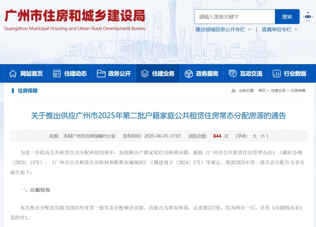 2025年6月5日,市住房保障办、广州安居集团分别在市住房和城乡建设局网站、“城壹宜居”公众号公布常态分配房源。申请对象可登录市住房和城乡建设局网站或微信公众号“城壹宜居”中的“常态分配”专区查看房源信息。